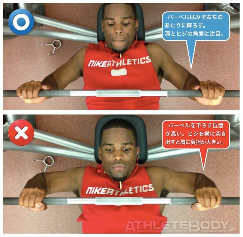- ウェイトを下ろすときは、やや脇を締めてヒジを身体の真横に突き出さない。(参考画像)